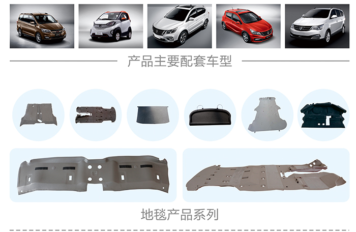 公司產(chǎn)品配套項目涵蓋轎車(chē)、MPV、SUV、新能源電動(dòng)車(chē)領(lǐng)域。公司主要參評有汽車(chē)頂棚、隔音墊、地毯、大型注塑件、橡膠制品、EPP泡沫等車(chē)內飾品件。